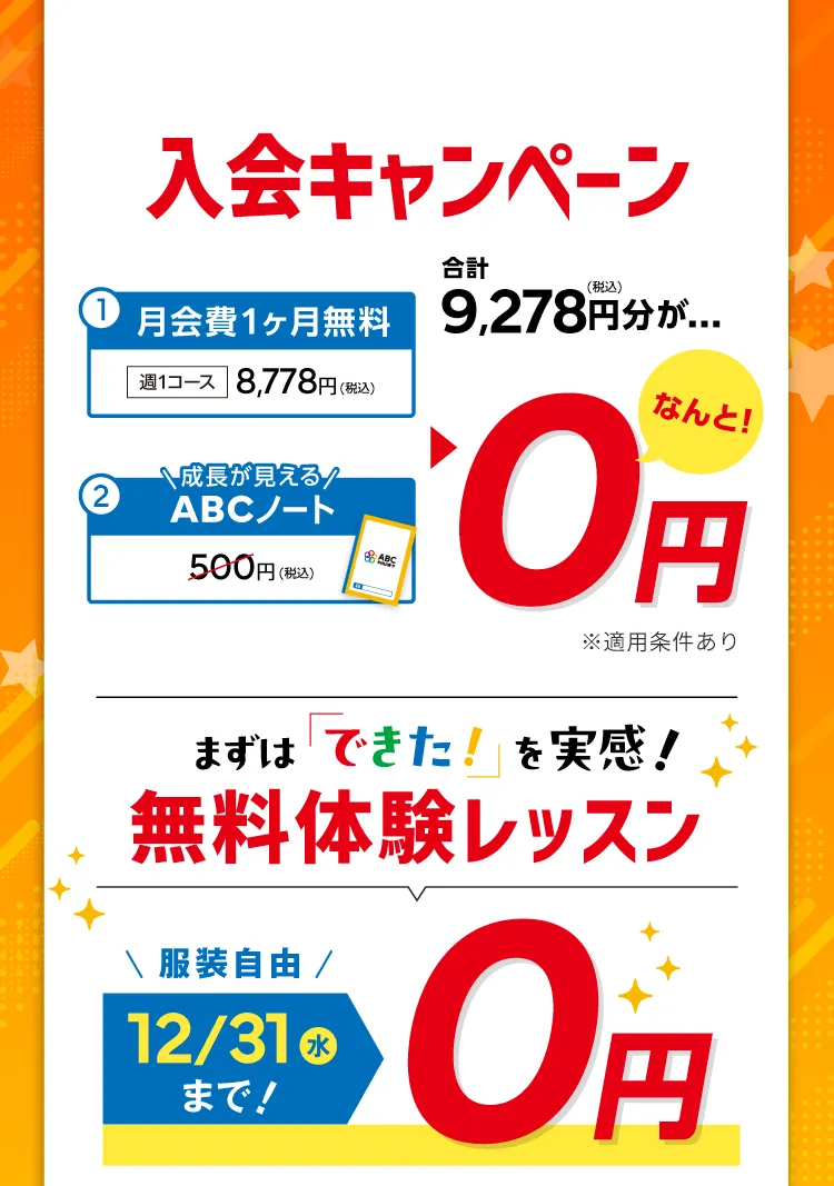 - ●ご利用開始1ヶ月間、週1コース【8,778/1ヶ月分】を特別価格[0円/1ヶ月分]に割引いたします。特典の適用には、特別価格終了後6ヶ月間の継続が必要です。