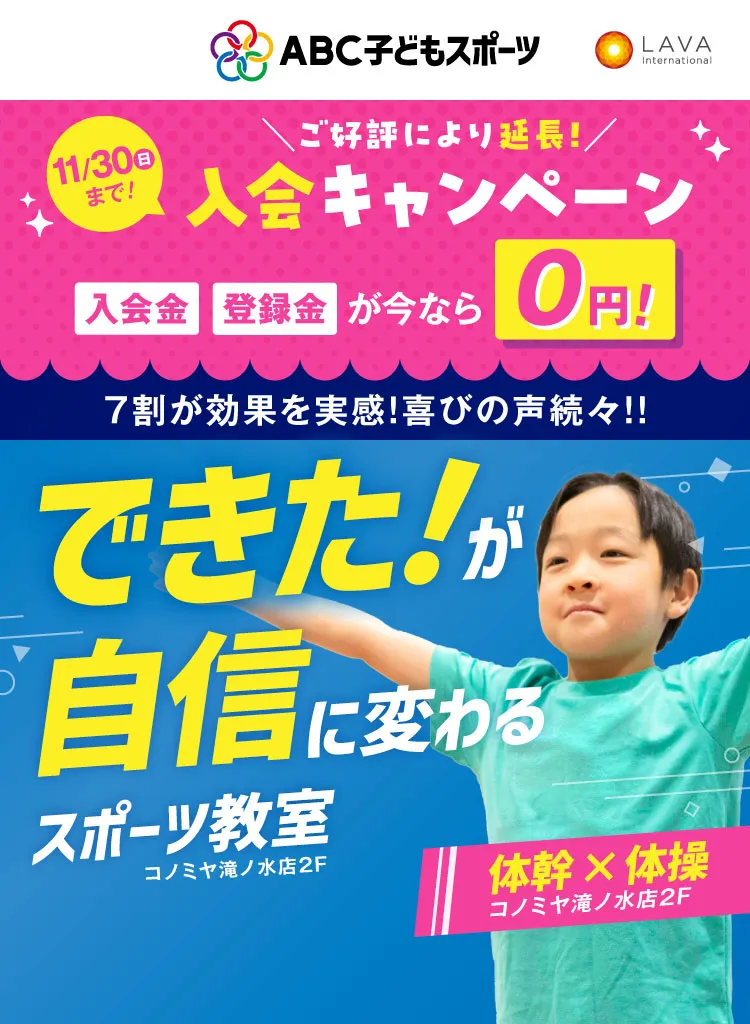 ABCでは、リズム運動・ヨガを始めとした300種以上のメニューを行うことで、運動能力を伸ばすだけでなく、チャレンジしたいと思えるきっかけを作りたいと考えています。「できた!」「楽しい!」という成功体験を積むことで、心身共に成長しながら未来の可能性を拡げてもらえると嬉しいです!